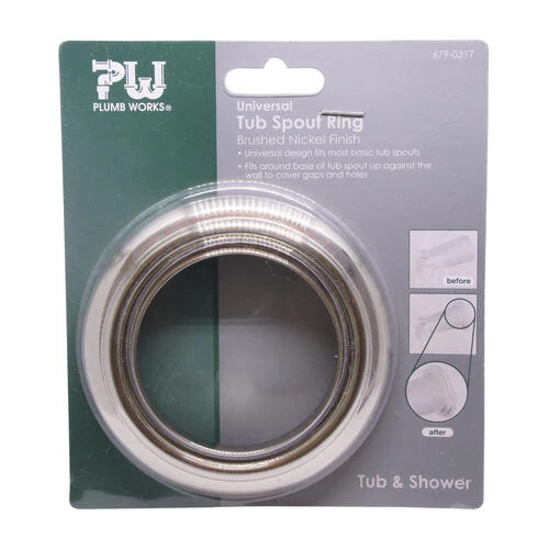 Add decorative flair to your basic tub spout with the Tub Spout Ring in brushed nickel. Adding the ring will cover unsightly gaps and holes where the tub spout meets the tub. It features durable plastic construction that will endure the rigors of everyday use.