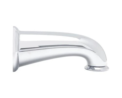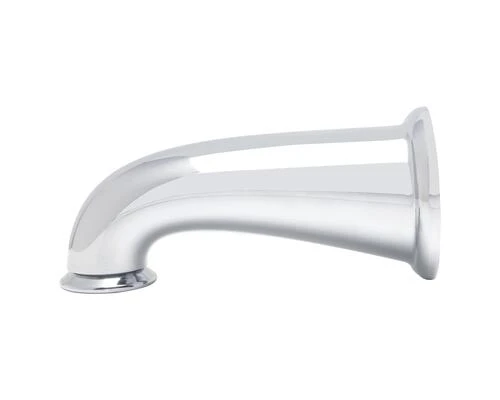 The Decorative Tub Spout in Chrome is constructed of metal to provide strength and durability. The spout is 8″ long and has a 7-1/4″ reach to provide an abundance of clearance space. It features a pull down diverter and universal design to fit many different faucet brands.