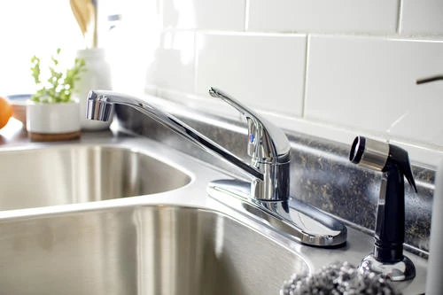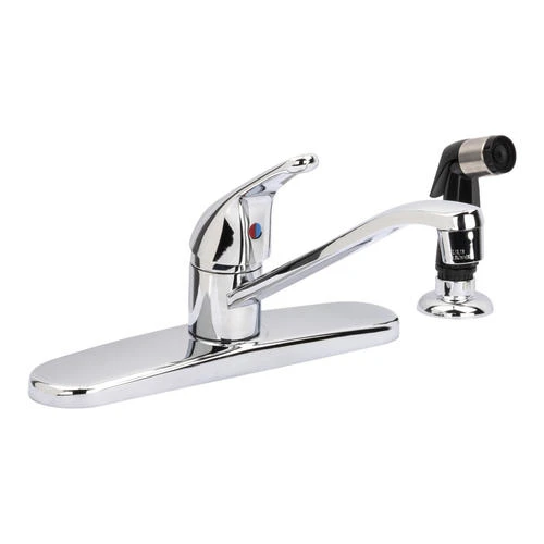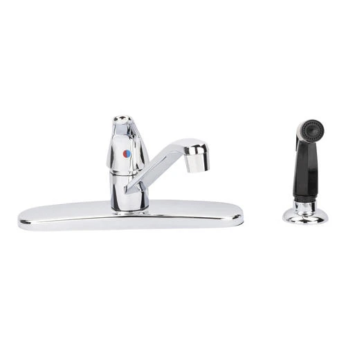 This Plumb Works® single handle chrome kitchen faucet will complement any kitchen Decor with style and functionality. This Plumb Works® features a zinc lever handle, swing spout, washerless cartridge, hybrid waterways, and a flexible hose for ease of use. This faucet can be used with or without spray. The total H of this faucet is 7.0? with a spout reach of 8.0?. Faucet requires 3 or 4 hole sink for installation.