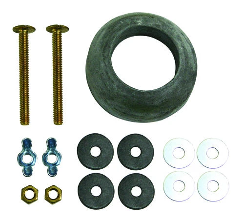This toilet tank-to-bowl connection kit includes a rubber gasket and brass bolts.