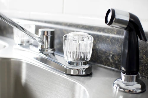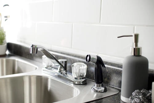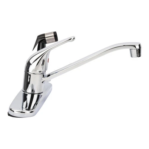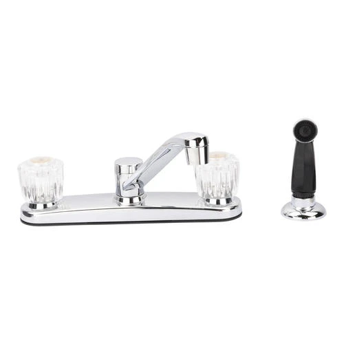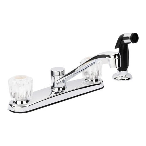 This Plumb Works® two handle chrome kitchen faucet will complement any kitchen Decor with style and functionality. This Plumb Works® features acrylic handles, a swing spout, washerless cartridge, hybrid waterway and a flexible hose for ease of use. Can be used with or without spray. The total H of this faucet is 8.5? with a spout reach of 8.0?. Faucet requires 3 or 4 hole sink for installation.