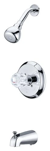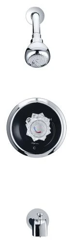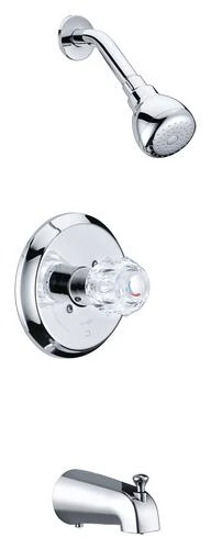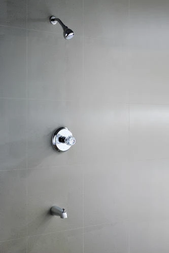The Bardwell one-handle pressure balance tub/shower faucet in a polished chrome finish has a vintage acrylic handle that is stylish and durable. This tub/shower valve has a number of solid construction features including solid brass waterway construction, integral stops and the option for back to back installation. The Bardwell offers a 2-3/4″ single function showerhead and a diverter tub spout. All Tuscany tub/showers have a ceramic cartridge for years of drip-free use.